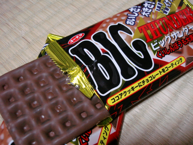 コンビニの菓子棚の一角で、肩をいからせている(?)「ビックサンダー」という菓子です。