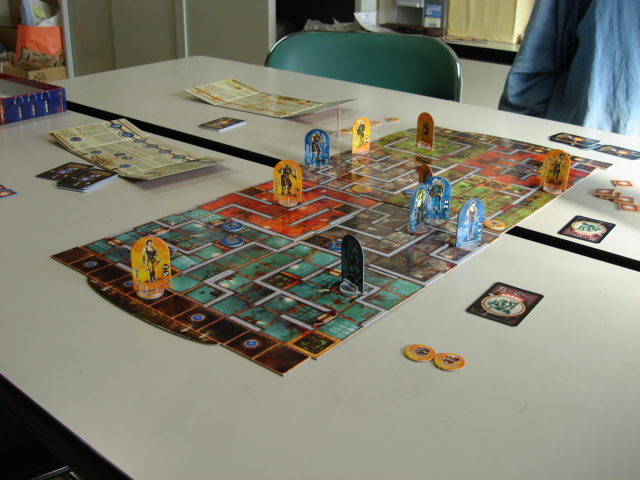 しかし、ダンジョンに迷い込んでいるキャラクターは8人(壁を通り抜けられる、鍵を開錠できる、負傷したキャラクターを回復できるなど)。途中に落ちているアイテムは6つ。それぞれに効果が割り振られているからさあ大変。説明するより、横にルールブックを置いてやった方が早いのではないだろうか?つくづく自分のインスト能力の無さを痛感しました・・・。